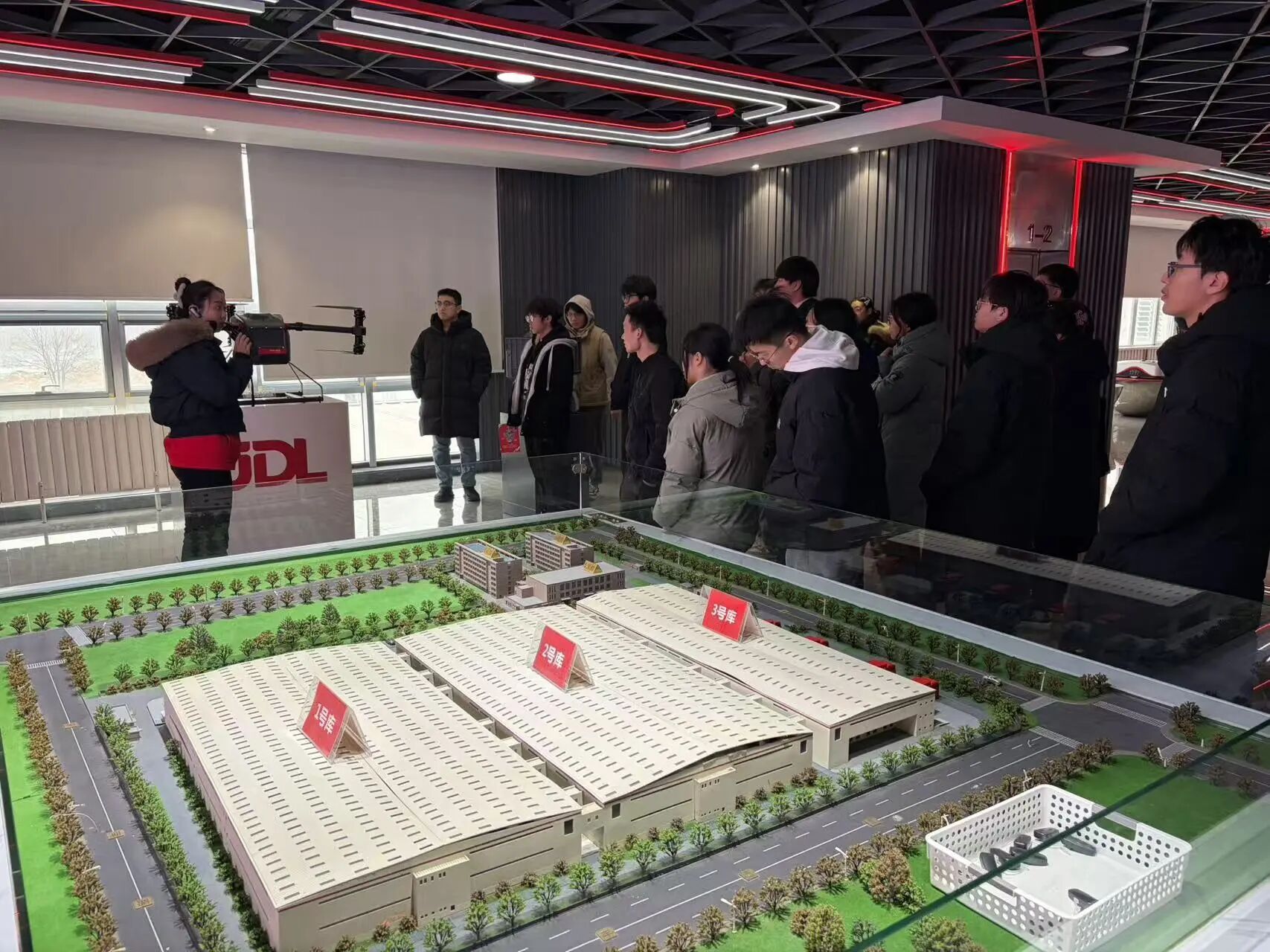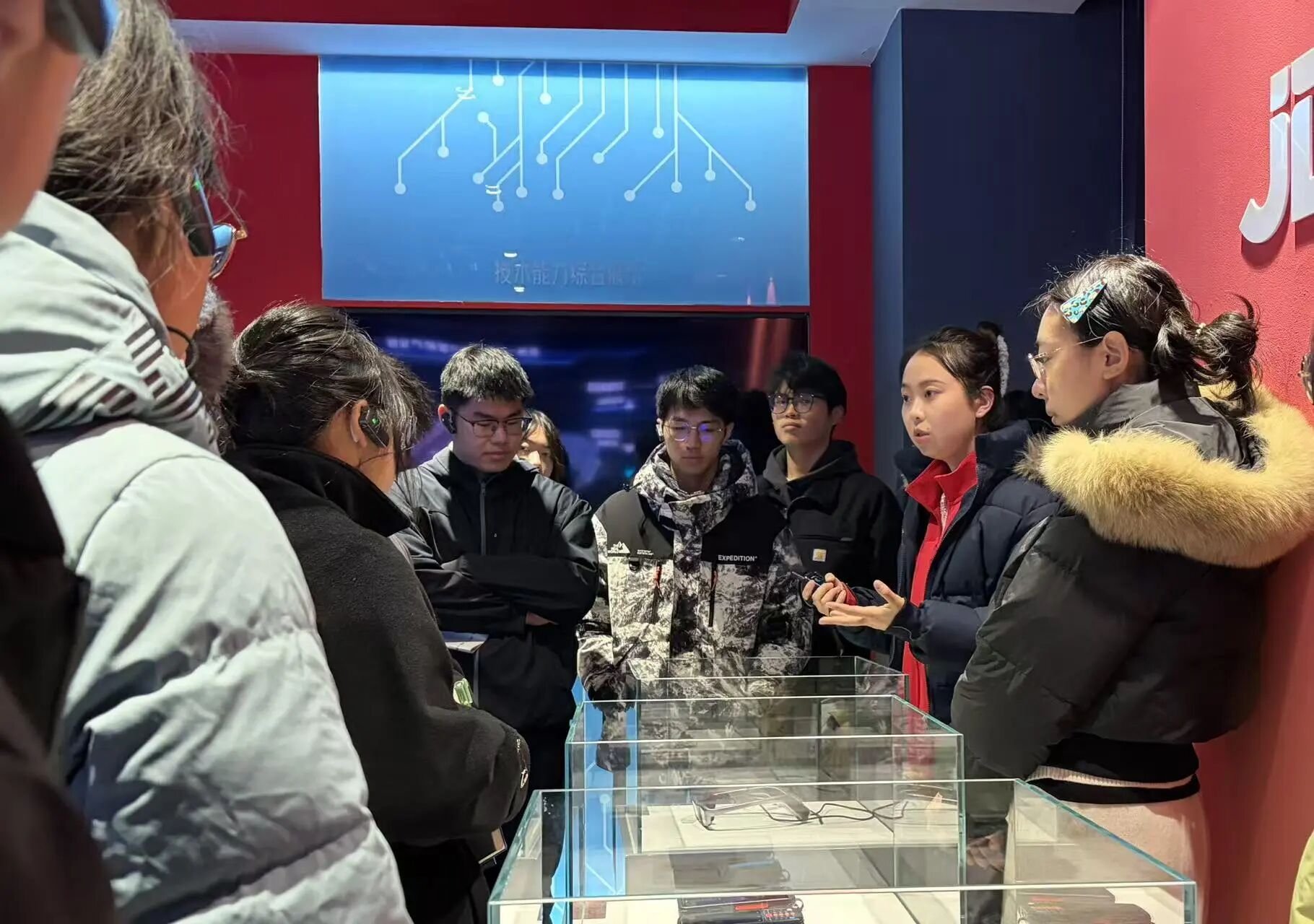 移步至智慧物流展示中心。在这里,科技的广度和温度得到了更立体地呈现。透过全景沙盘,大家整体把握了京东“亚洲一号”覆盖全国的智能仓网布局,理解了其在现代商业物流中的核心作用。展台前,从高速运转的堆垛机、流畅分拣的交叉带系统,到基于大模型的路径优化与需求预测演示,每一项技术都让同学们看见:数据,已成为驱动物流体系向前飞跃的新引擎。