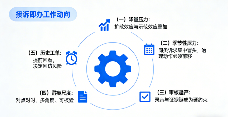 杨老师首先梳理了近期接诉即办工作的五大核心动向。一是降量压力下,扩散效应与示范效应叠加,需注重规则边界与预期管理;二是季节性诉求集中冒头,治理动作必须前移,变临时处置为预防处置;三是审核标准日趋严格,录音与证据链成为硬约束,要求履职过程真实可核验;四是留痕工作需做到对点对时、多角度可验证,避免证据缺口与逻辑断裂;五是历史工单对回访评价起决定性作用,需提前回看研判,明确治理动作的连续性。