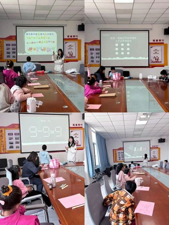 暖场告一段落,核心数学闯关环节正式拉开帷幕。多重趣味挑战层层递进,全方位锻炼孩子们的逻辑思维与观察能力。在一笔画挑战中,社工抛出问题:如何一笔画出四条直线将九个点串联起来,并鼓励大家大胆思考、尝试多种方法,孩子们积极动脑、踊跃分享思路,社工随后揭晓答案,引导大家打破固定思维,感受几何思维的乐趣。移动一笔挑战火热开启,孩子们认真观察、积极思考,在动手尝试中提升观察力与专注力,现场思考氛围浓厚。